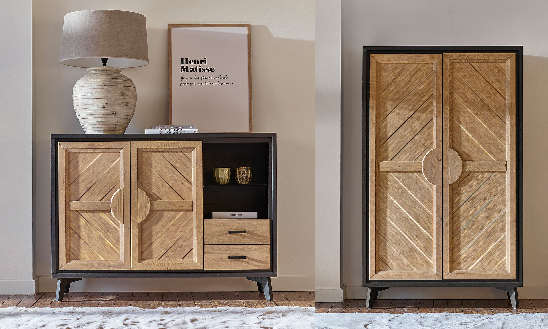 Panneaux de portes en médium plaqué. Tablettes intérieurs et derrières portes bois ou vitrées. Montants et traverses chêne massif. Pieds chêne massif laqué noir mat. Fabriqué en France.
