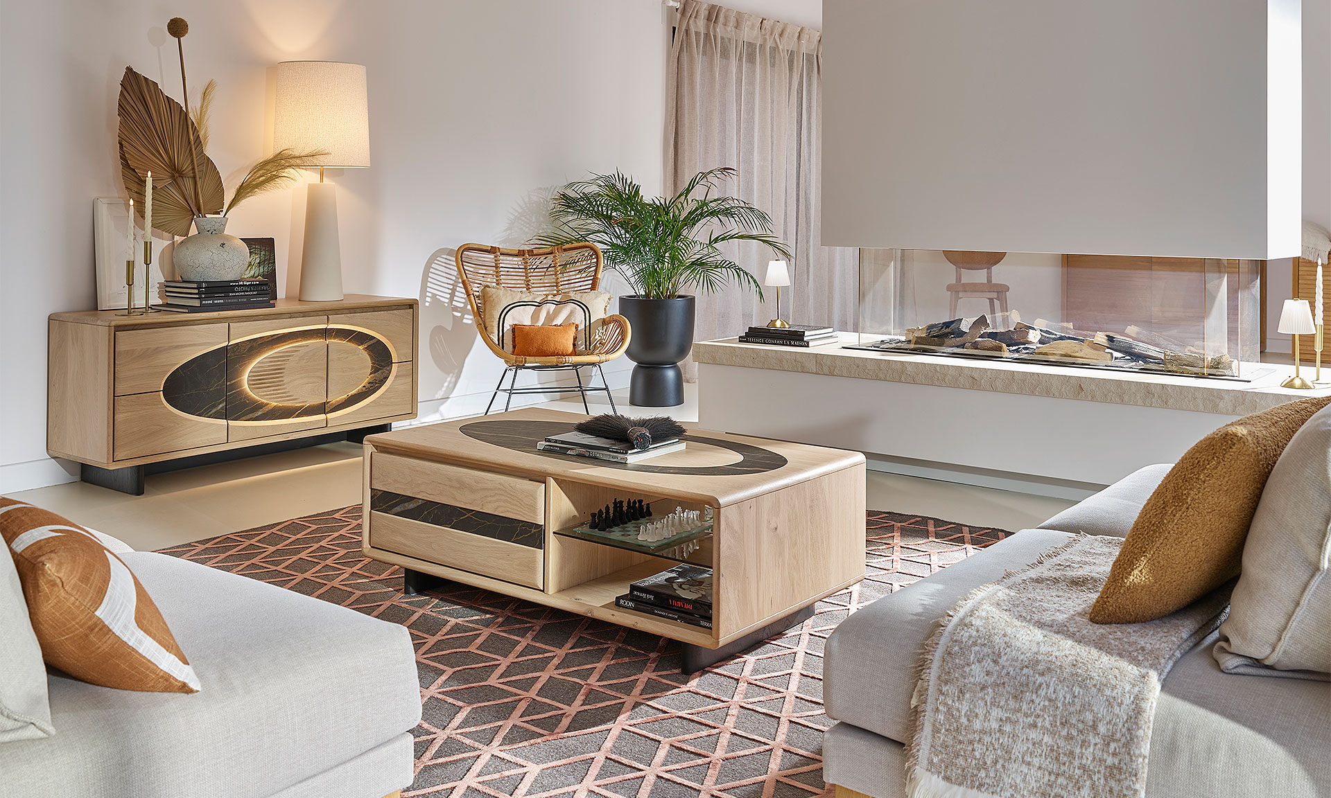 Meuble en chêne qualité rustique. Fabriqué en France. Céramique marbrée.